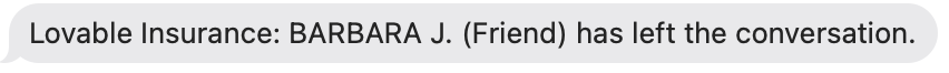 If a participant enters the LEAVE keyword or is removed from the conversation by an operator, all participants on the conversation, including the one removed, will receive a "<Participant Name First and Last Initial> (<Relationship>) has left the conversation." message confirming the participant has been removed.