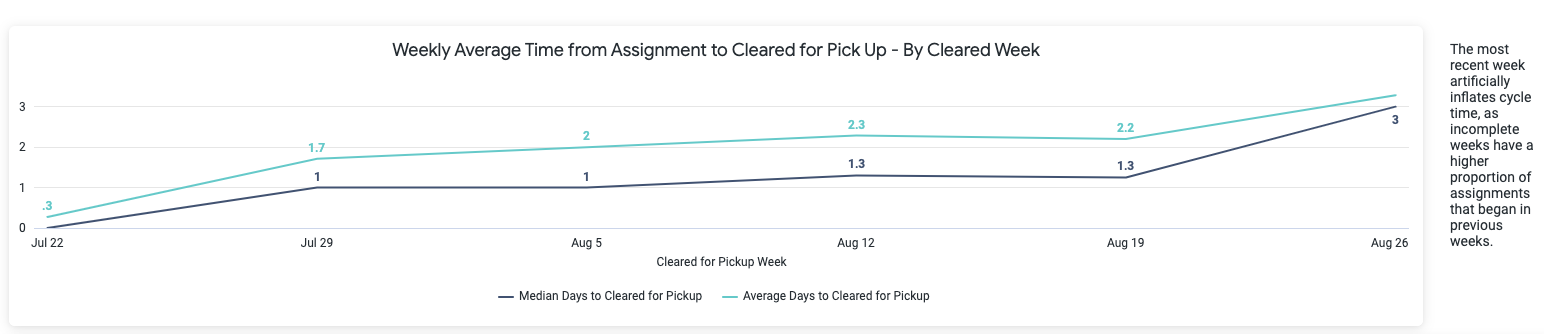 | Weekly Average/Median Time from Assignment to Cleared for Pickup. | The week by week view of the average and median Assignment to Clear for Pickup time based on the date the vehicle was Cleared for Pickup. NOTE: The most recent week artificially inflates cycle time, as incomplete weeks have a higher proportion of assignments that began in previous weeks. | |