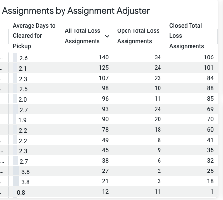 | Copart Assignments by Assignment Adjuster | Based on the name and email of adjuster assigned in Copart (Assignment role), it shows the average days from assignment to clear for pickup, all total loss assignments, and how many of those assignments are open vs. closed. | |