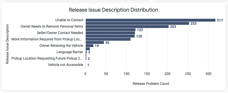 | Release Issue Description Distribution | The volume of release issues by type (ex: VERBAL RELEASE REQUIRED, LANGUAGE BARRIER, etc.) | |
