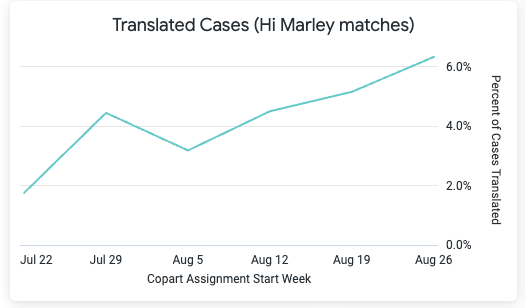 | Translated Cases (Hi Marley matches) | Weekly trend: percent of total cases that are translated | |