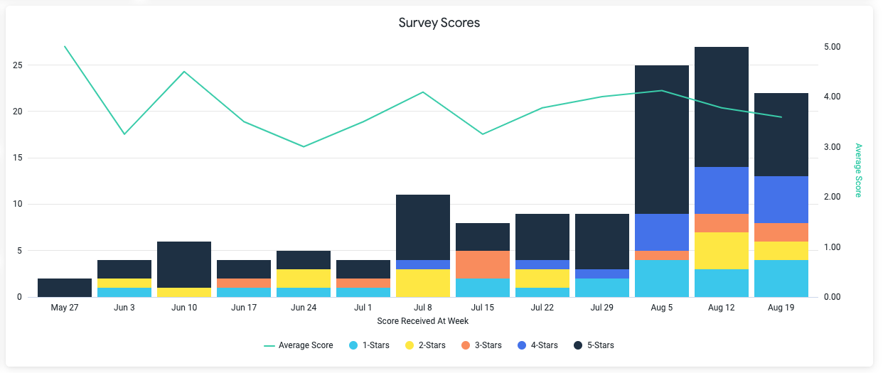| Survey Scores | A weekly trend of survey count, average score, and distribution |
