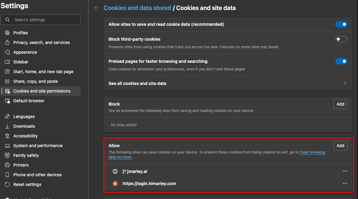 - Type in the URL '[*.]marley.ai', ensure that "including third party cookies" is selected.