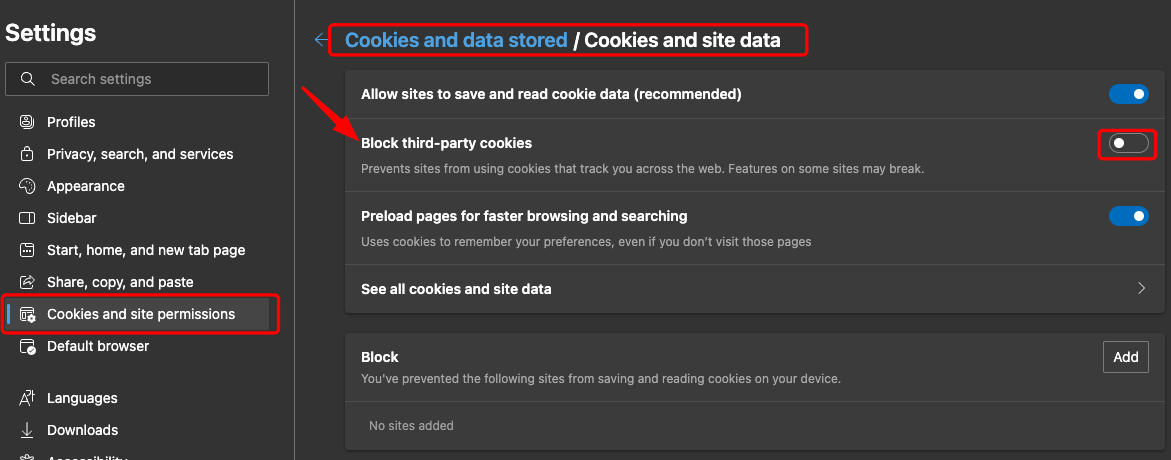 - Scroll down to "Sites that can always use cookies" and select "Add"