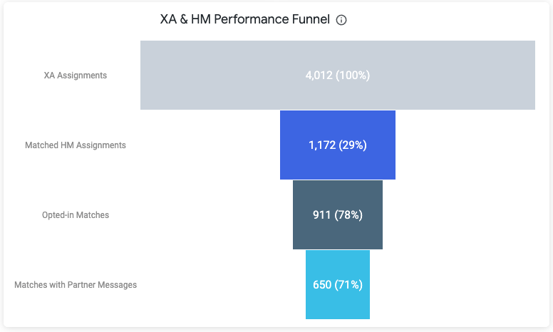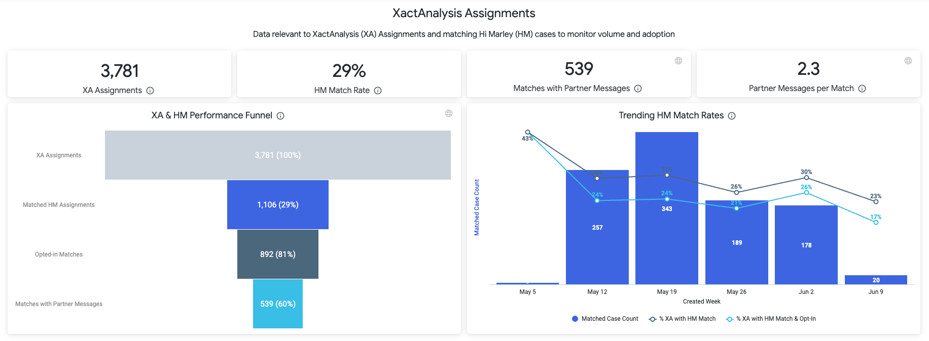 | Matches with Partner Messages | The number of XactAnalysis assignments with a matching case in Hi Marley and at least 1 automated outbound Partner Message during the selected timeframe. | |