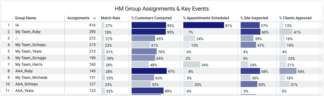 The HM Group level assignment counts, match rates and frequency of key events.