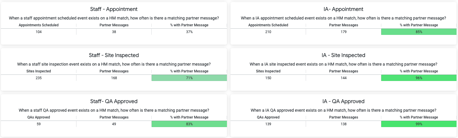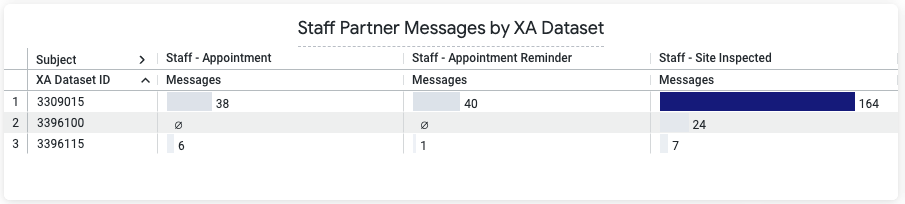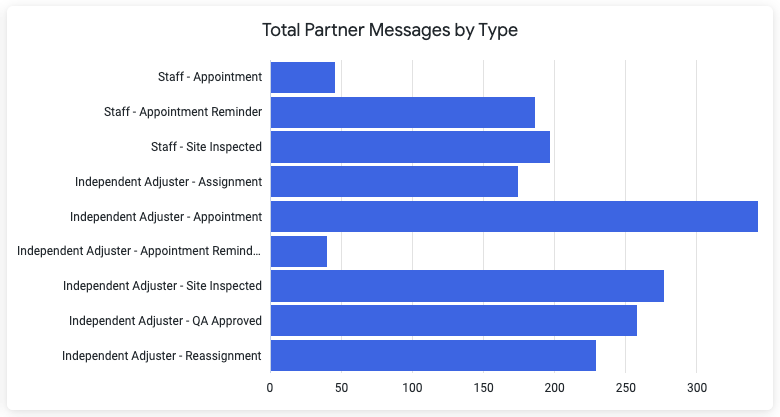 | Staff & IA XactAnalysis Dataset Level Partner Messages | For key XactAnalysis events, how frequently are automated Partner Messages being sent on a adjuster type and XactAnalysis Dataset level? | |
