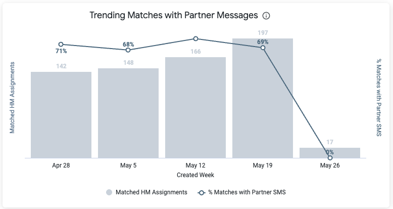 | Trending Matches with Partner Messages | Displays the weekly trending count of matched Hi Marley assignments and the relative % of those matches containing an automated Partner Messages, including the current week | |