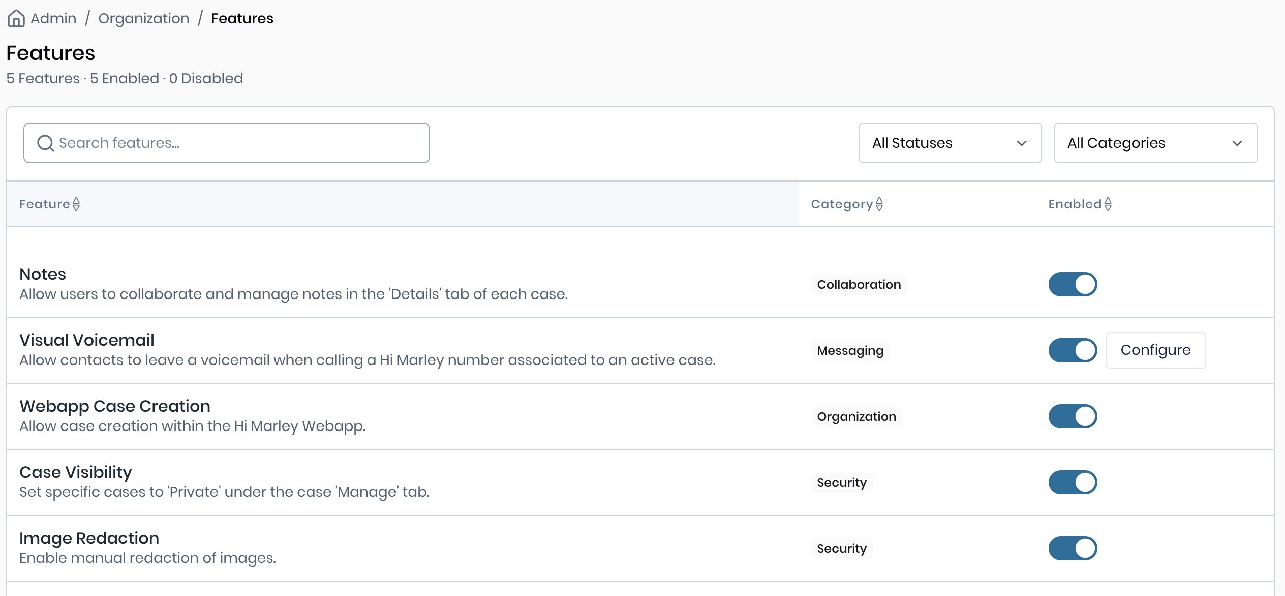 This new page provides a centralized place to view and manage feature-level settings that shape the user experience in Hi Marley.