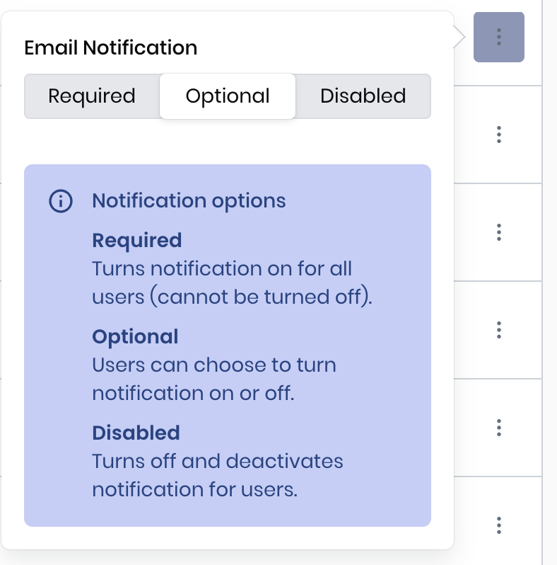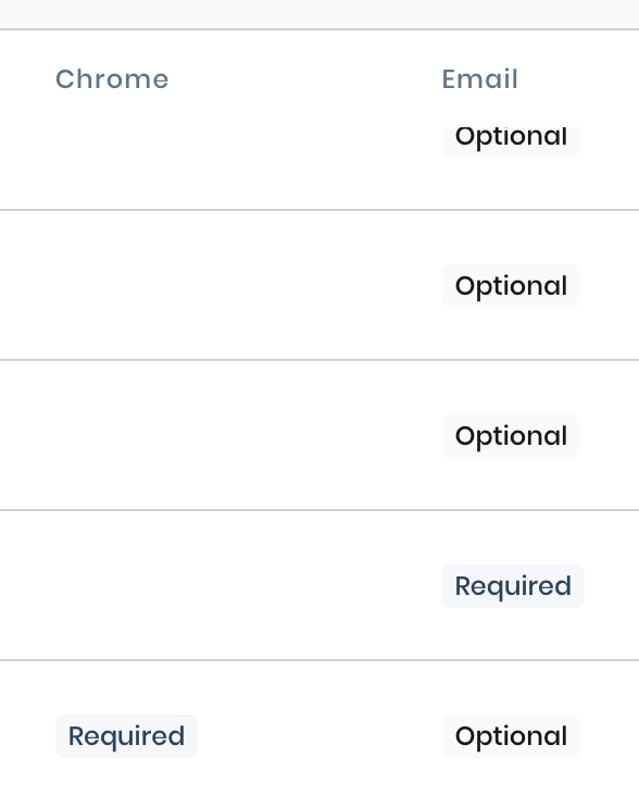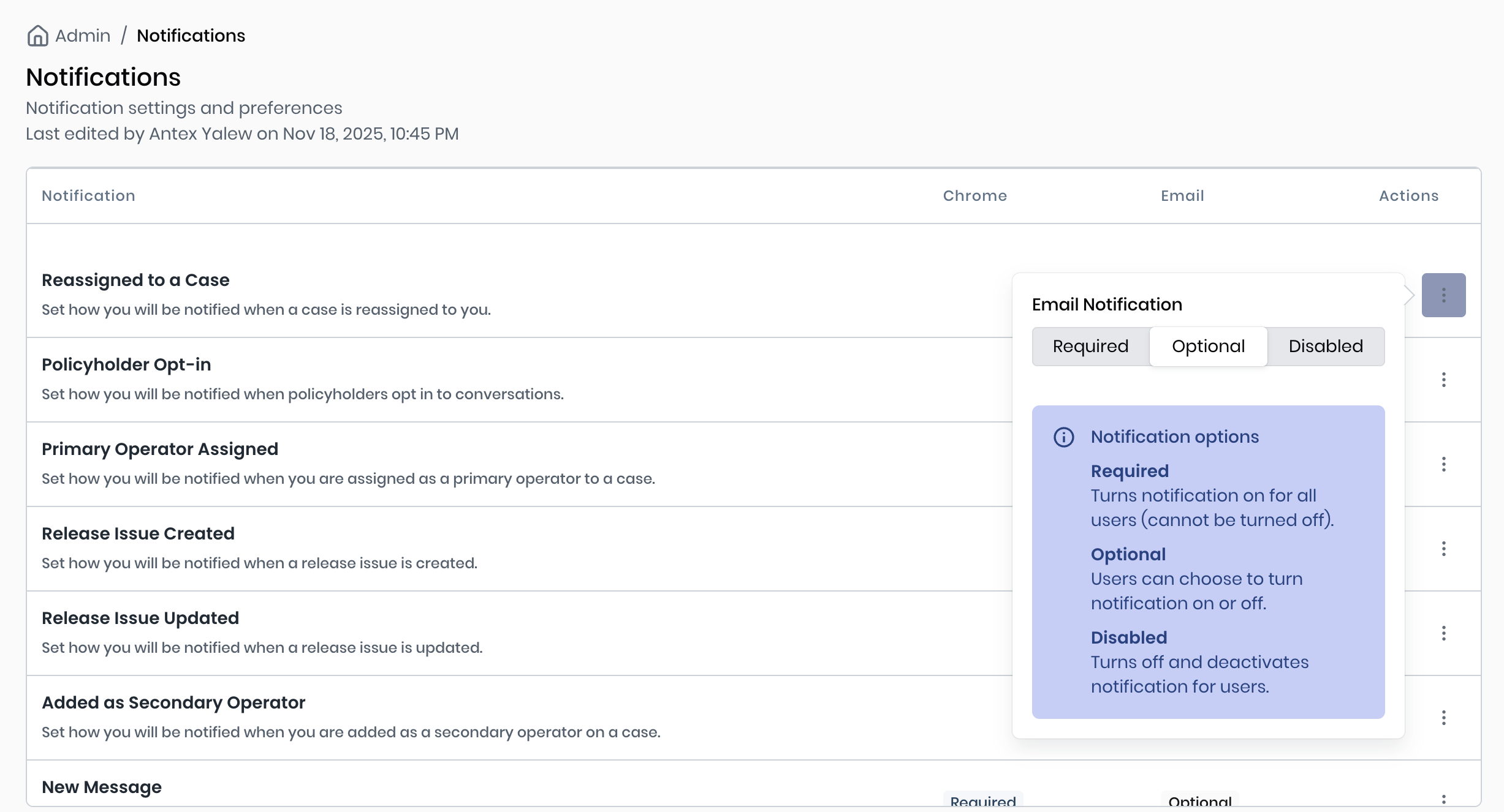For example, for the New Message notification if the chrome notifications may be set to Required and the email notifications may be set to Optional, this ensures users never miss incoming messages, while still allowing them to manage email volume.