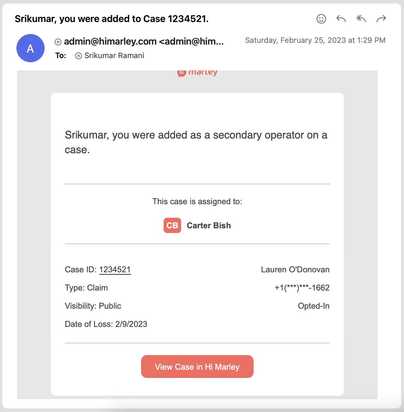 Lorsque vous êtes ajouté à un dossier en tant qu'Opérateur Secondaire, vous recevrez un courriel vous informant que vous avez été ajouté à un dossier. Ce qui suit vous donnera une idée de ce à quoi ressemblera cette notification par courriel. Il y aura un bouton dans le courriel qui, si vous cliquez dessus, vous amènera directement au dossier auquel vous avez été assigné dans Hi Marley.