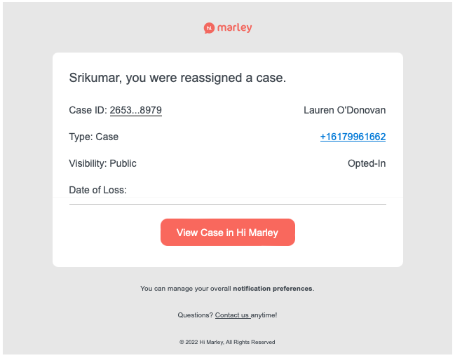 Si un dossier a été réassigné d'un autre Opérateur Principal à vous, vous recevrez un courriel vous informant que vous avez été réassigné à un dossier. Voici un exemple d'un courriel de réassignation. En cliquant sur le bouton "Voir le dossier dans Hi Marley", vous serez directement dirigé vers le dossier dans Hi Marley.