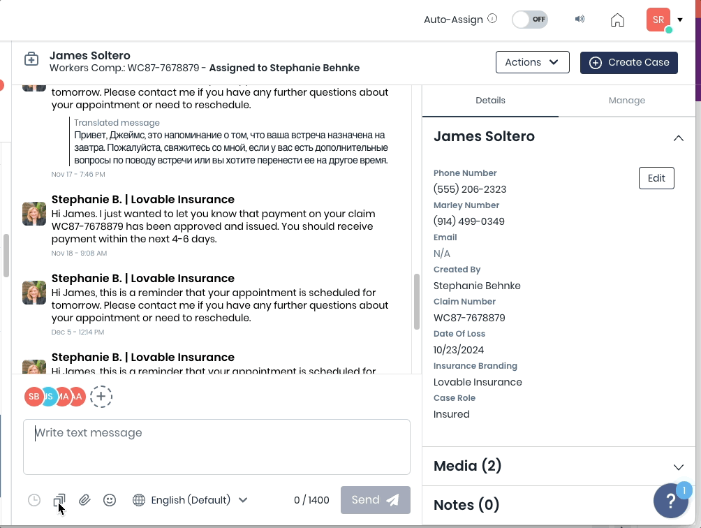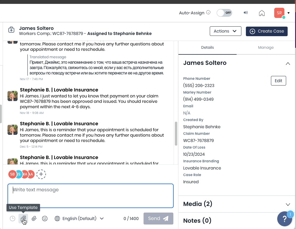 Lorsque un modèle de message est sélectionné dans Chats, l'opérateur peut toujours taper, supprimer ou éditer le message avant l'envoi.