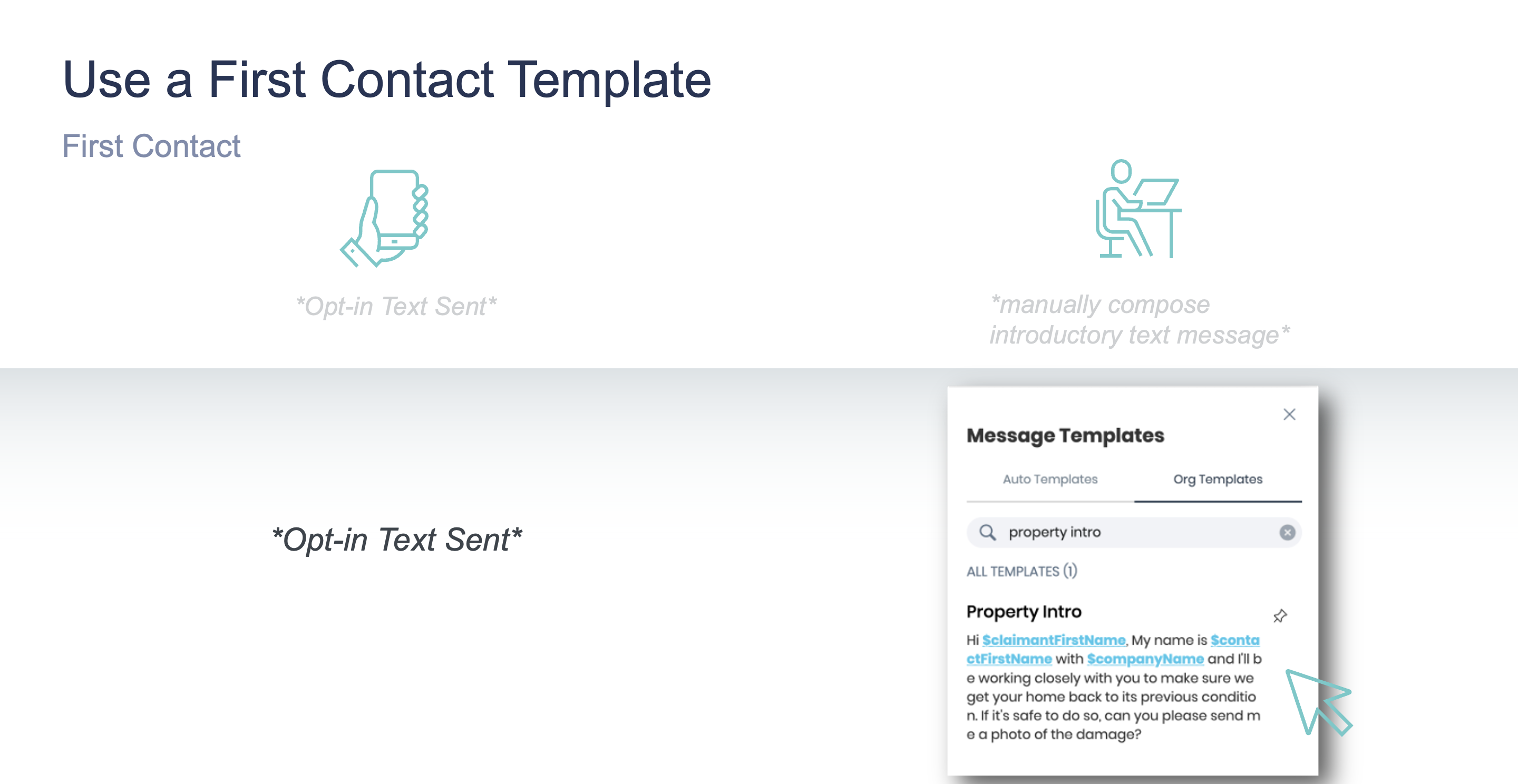 R : Utilisez le contact téléphonique initial pour obtenir le consentement pour les textos Hi Marley. Confirmez le consentement dans Hi Marley et assurez au titulaire de police que le fil de discussion par texto est un moyen facile de vous joindre, en utilisant un message modèle pour plus d'efficacité.
